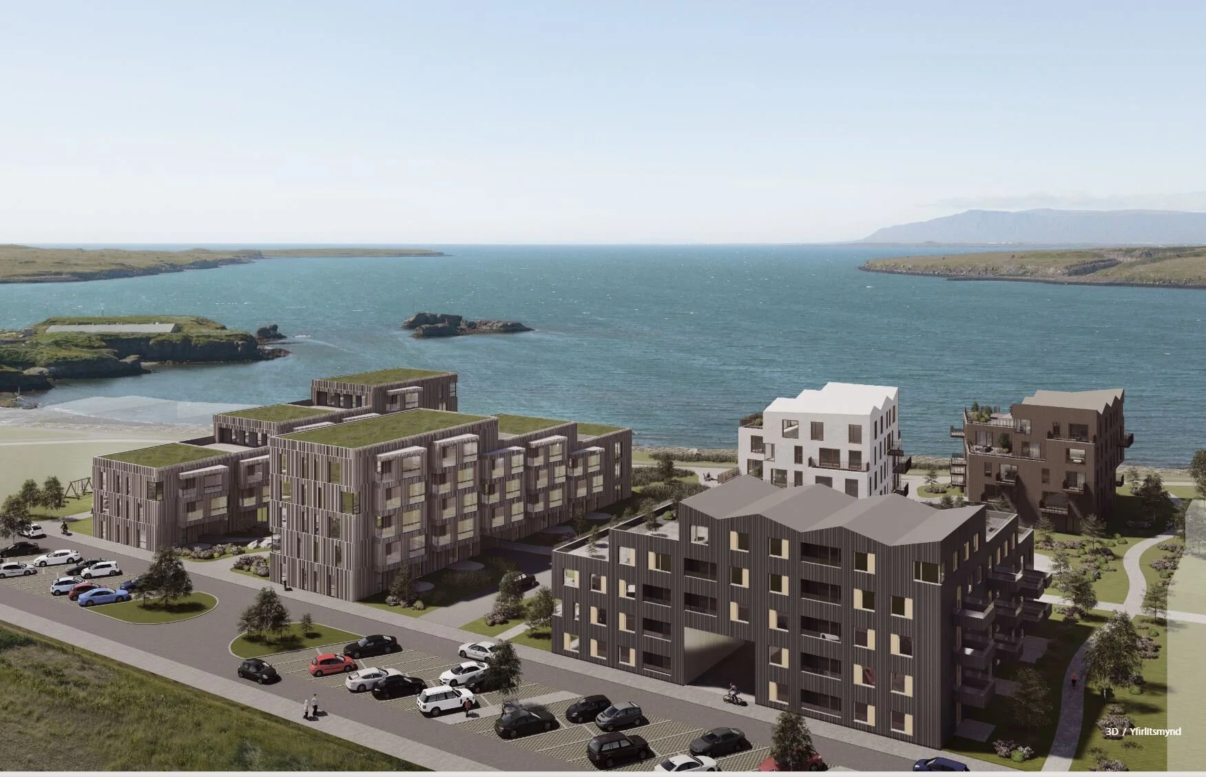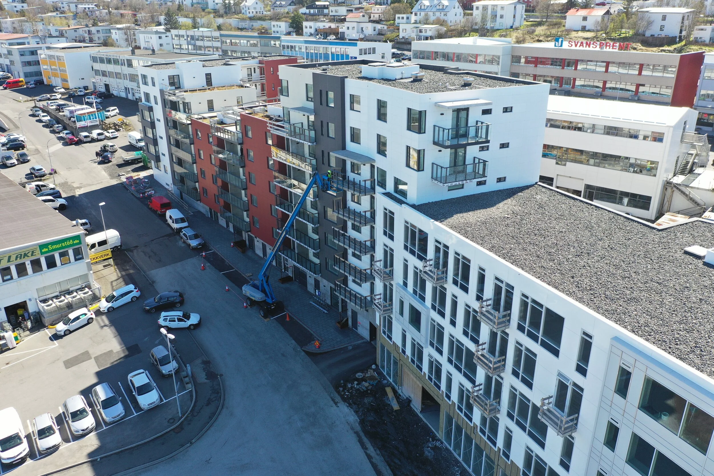 Lýsing: 68 íbúðir á 4-8 hæðum í 5 stigahúsum ásamt 2.500 m² verslunar- og skrifstofuhúsnæði á 5 hæðum.